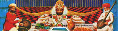 At lunchtime, Ramdevji, by his miraculous powers, accommodated all the Pirs and Fakirs from Multan on a single piece of carpet, say 3'x 3' which when sat upon extended another 3' at a time. The Fakirs would only eat from their utensils, which they had left behind in Multan and so Ramdevji extended his right hand and produced all the necessary utensils for them to eat from.